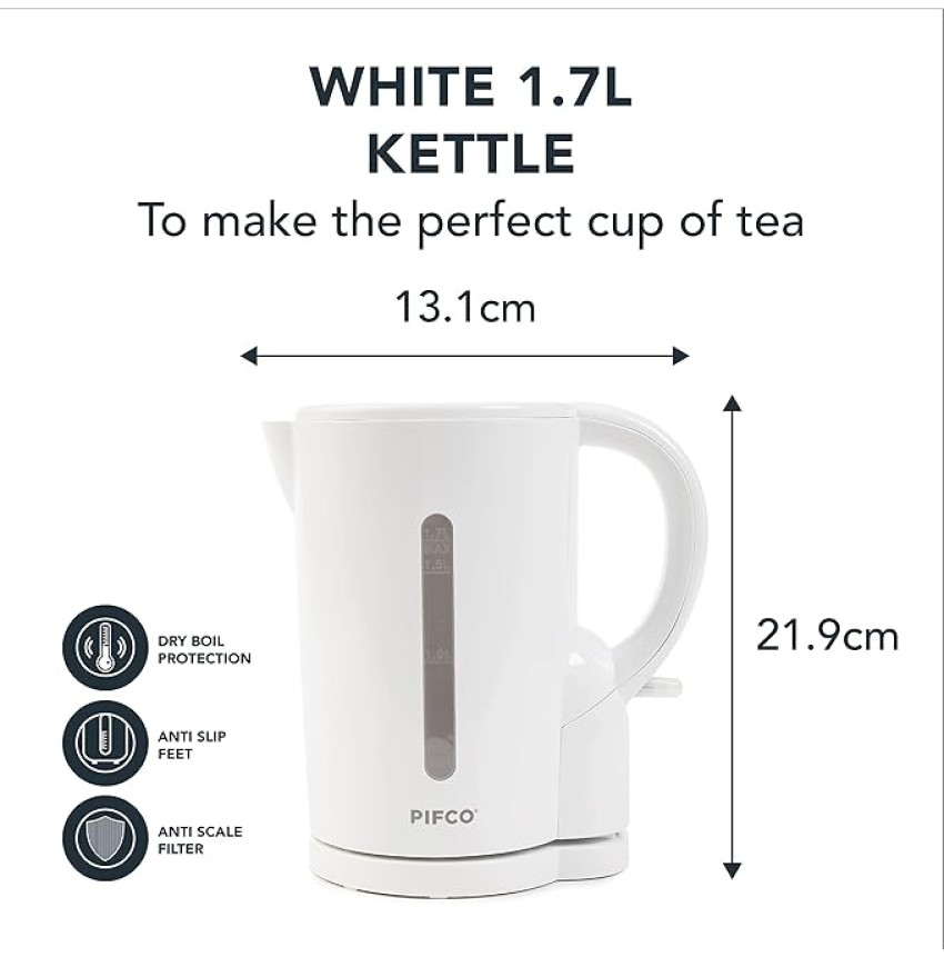 - Compact and Portable White Kettle: This white kettle is perfect for small spaces and travel. Its 1.7L capacity and cordless design make it ideal for any kitchen.
