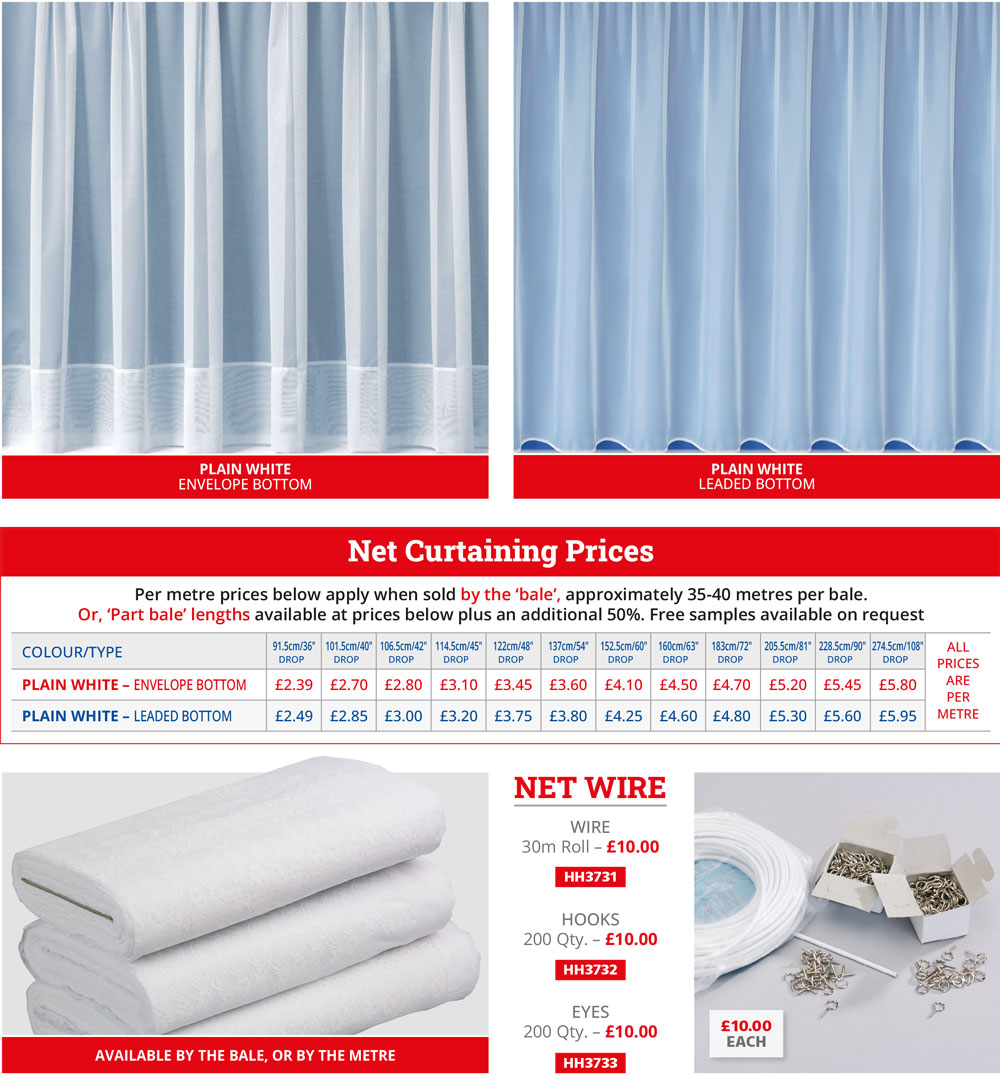 Net curtain wire, hooks and eyes, are all readily available. Please click here to visit this section.