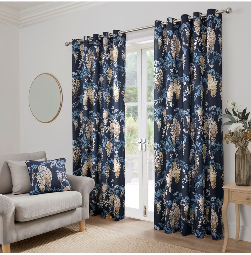 A gorgeous hand-painted wisteria floral cascades across rich navy background on these stunning lined curtains. The curtains have been made with an eyelet heading style that are easy to install and will drape beautifully.